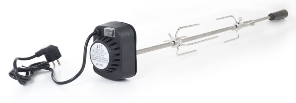 A másik oldalon a motor található szintén műanyag fedéllel, melyen található a ki-és bekapcsoló gomb. A 230 V motort egyszerűen csak csatlakoztatni kell az áramkörbe a 125 cm-es tápkábellel. A motor segítségével a nyárstű percenként kb. 2x fordul, így biztosítva az egyenletes sütést.
