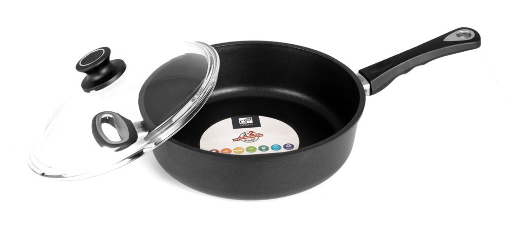 Ötrétegű vastag aljú, tapadásmentes LOTAN® felületű, kerek serpenyőben plusz zsír használata nélkül süthet, főzhet, pörkölhet. Univerzális, minden típusú tűzhelyhez. Garancia 2+2 év, Németországban gyártva.