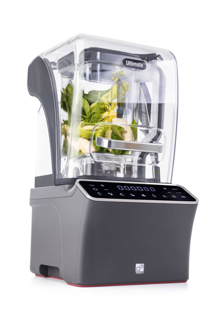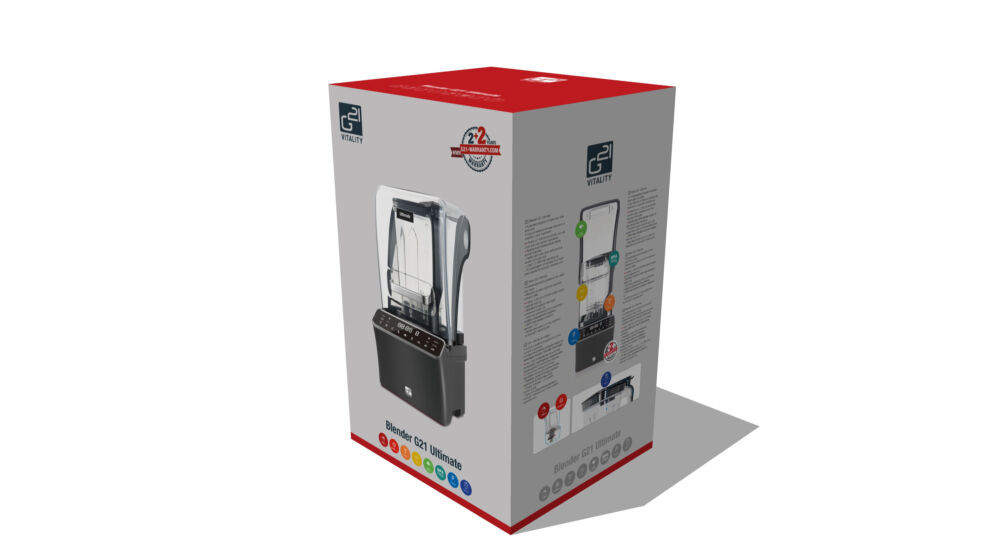 Az attraktív, modern kialakítású asztali turmixgép nagy előnye a hangszigetelő burkolata. A G21 Ultimate turmixgép működése tehát lényegesen csendesebb, mint más asztali turmixgépeké. A hangszigetelő burkolat átlátszó, így nem akadályozza a keverőtál tartalmának megtekintését. Ugyanakkor a fedél biztonsági zárként is szolgál - a turmixgép csak akkor indul el, ha a fedél megfelelően le van zárva.