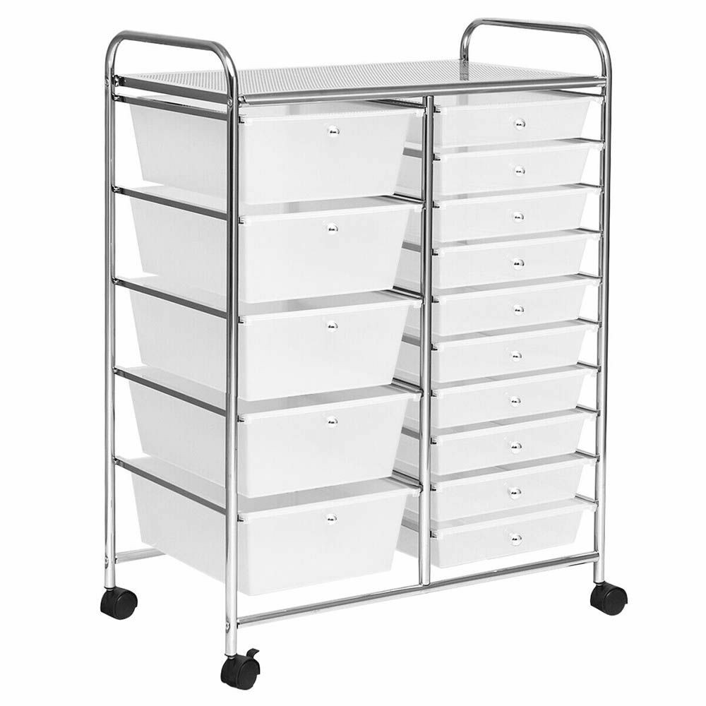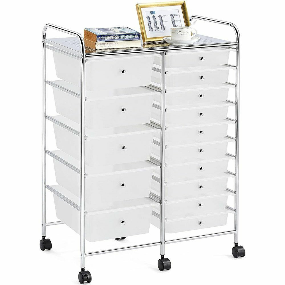 Irodákban, szépségszalonokban de az otthoni háztartásban egyaránt gyakori probléma, hogy nincs elegendő hely a kiegészítők és felszerelések tárolására. Erre jelent praktikus megoldást a 15 fiókos tároló kocsi, mely 5 nagyobb és 10 kisebb méretű fiókkal lett ellátva, így szortírozhatod holmidat és mindennek megtalálhatod a tökéletes helyet. Kerekekkel felszerelt, így megpakolt állapotban is könnyen mozgathatod. Krómozott vázának és letisztult stílusának köszönhetően bármely stílusú helyiségben elhelyezheted.