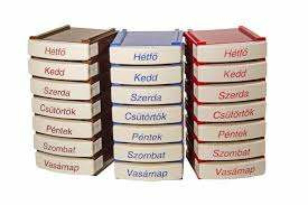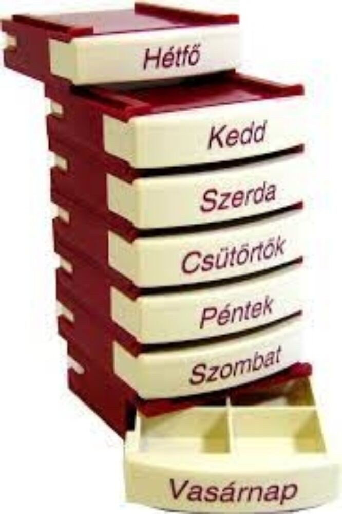 Több féle színben kapható (kék, bordó, barna) napi és heti gyógyszeradagoló, magyar felirattal, műanyag