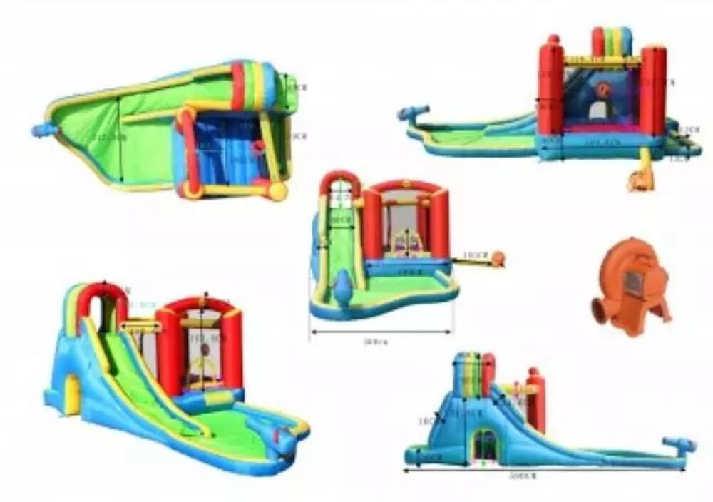 Csomag tartalma: légvár + befúvó motor + szállító táska + rögzítő cövekek + javító készlet + vízcső + 30 db kislabda