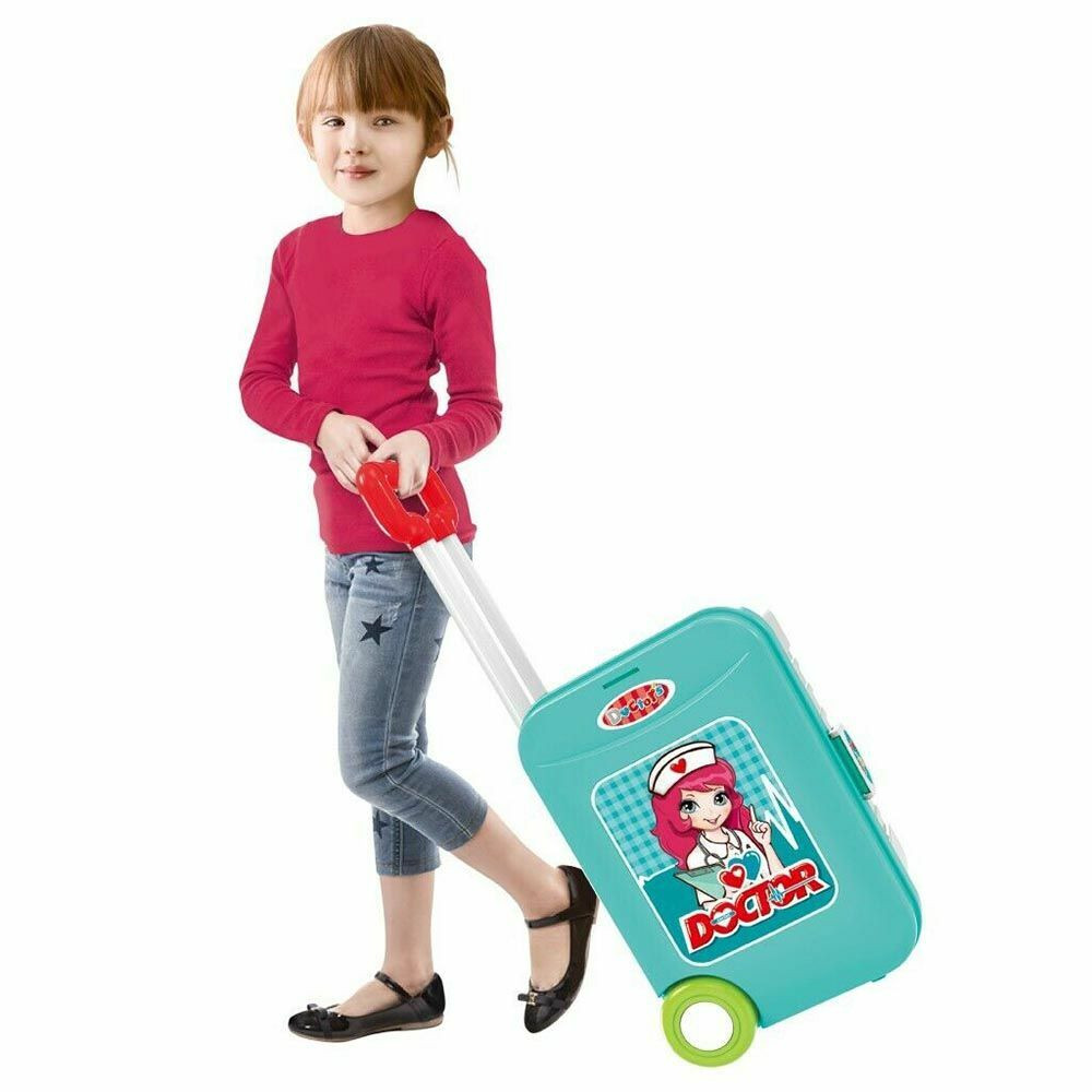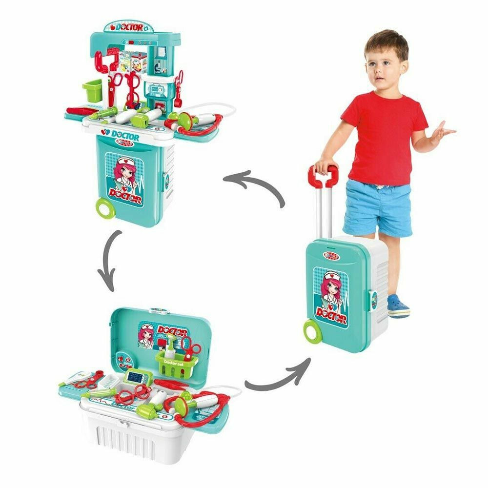 A gurulós bőrönd szett segítségével a gyerekek játékosan ismerkedhetnek meg a különböző szakmákkal. A praktikus 3 az 1-ben bőrönd könnyen hordozható és átalakítható. A gyerekek a szerepjáték során kipróbálhatják hogyan telik egy szakember napja, ami a személyiségük fejlődéséhez is hozzájárul. A kommunikációs képességük, fantáziájuk és kreativitásuk is fejlődhet a játék közben. A játék 3 típusban érhető el: konyhai szett, orvosi szett és szerszámkészlet.