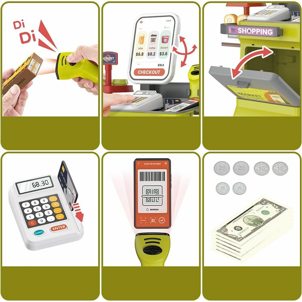 A praktikus tárolók és polcok segítségével minden termék a helyére kerülhet. A játékélményt egy bevásárlókocsi fokozza, melyet tologathatnak a gyerekek. A szetthez tartozik kódolvasó, mérleg és bankkártya terminál is. Zárható pénztárgép gondoskodik arról, hogy a megkeresett pénz biztonságban legyen.
