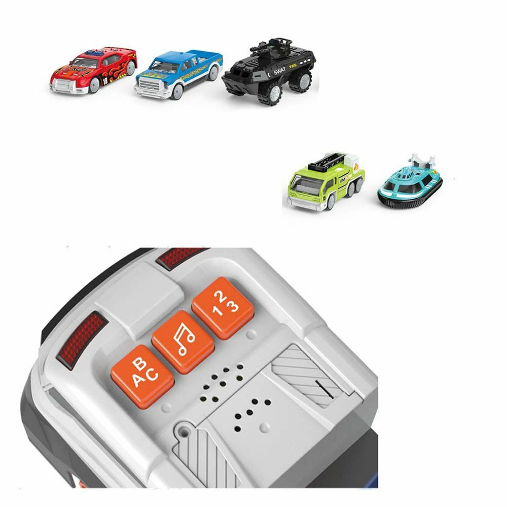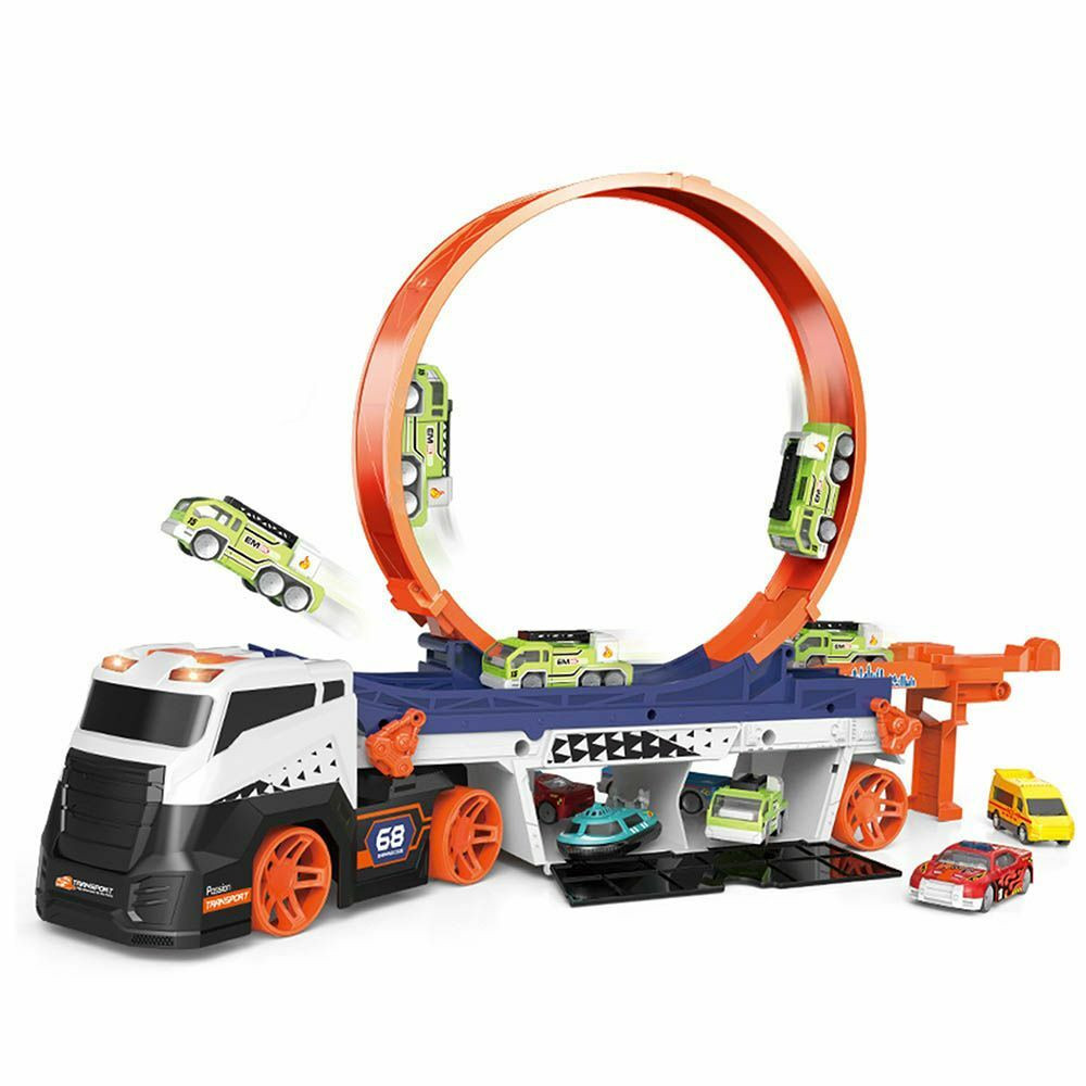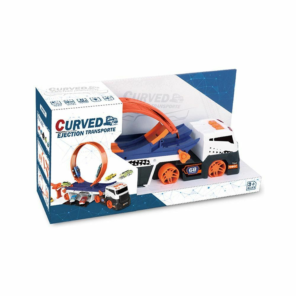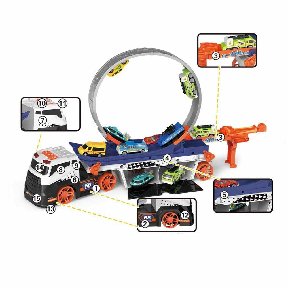 Kamion hurokpálya az igazi kaszkadőr élmény érdekében. A kilővő gombbal kellő sebességet adhatsz a kisautóknak, amik így könnyedén átfordulnak a hajmeresztő pályán. A különleges kialakításnak köszönhetően extrém vizuális élményt nyújt. A kamion könnyen összecsukható, így bárhová magatokkal vihetitek, vagy használható parkolónak is a már meglévő gyűjteményhez.