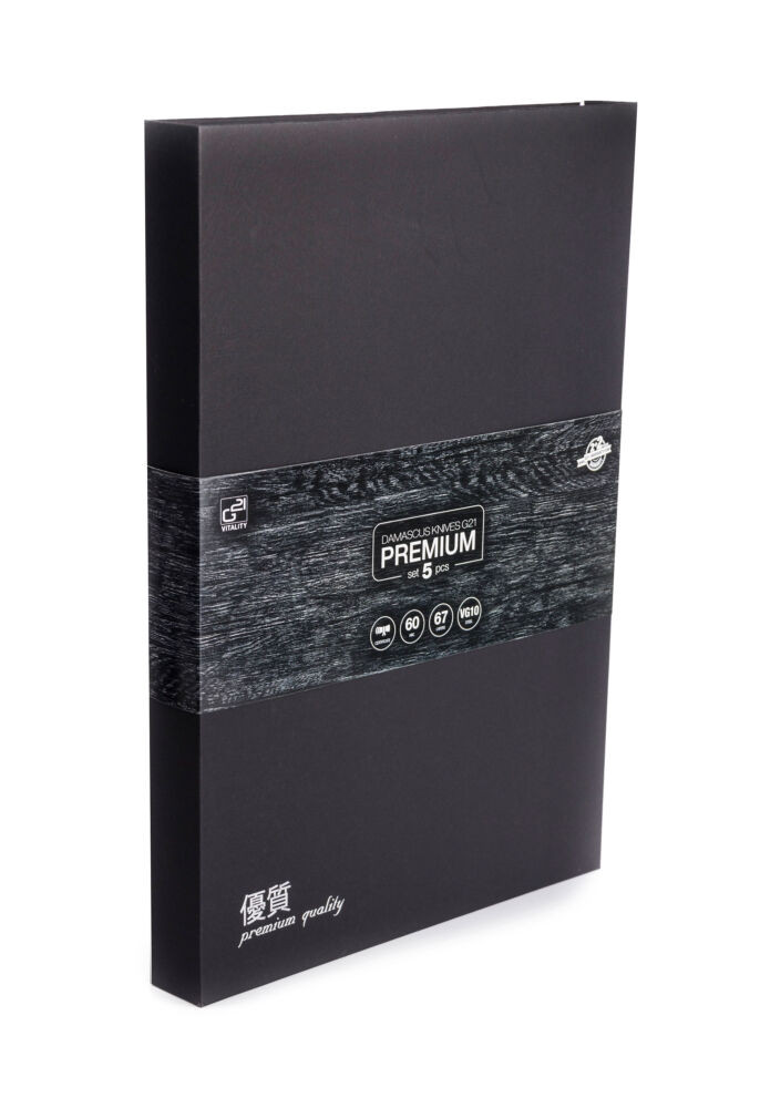 A G21 Damascus Premium késkészlet tartalmaz egy 20 cm-es vágókést és séfkést, egy 17 cm-es Santoku kést és két univerzális kést 9 és 13 cm-es pengével, valamint egy bambusztömböt, és egy csiszolókövet.