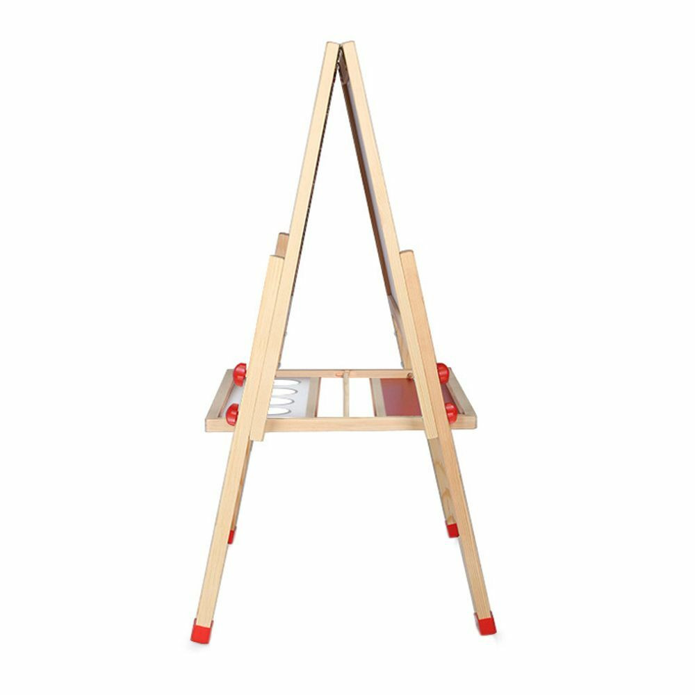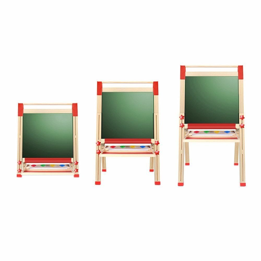 Az állítható magasságú játéktáblának 2 különböző anyagú felülete van. Az egyik a hagyományos krétatábla, melyen a gyerekek gyakorolhatják az ábécét, az összeadást, vagy színes krétával kreativitásukat fejleszthetik. A tábla másik oldala fehér mágneses felület amelyre filctollal írhatnak a kicsik. A szett tartalmaz 4 darab színes tolltartó poharat, és egy papírtekercset is amelyet a táblán található csiptetővel rögzíthetünk.