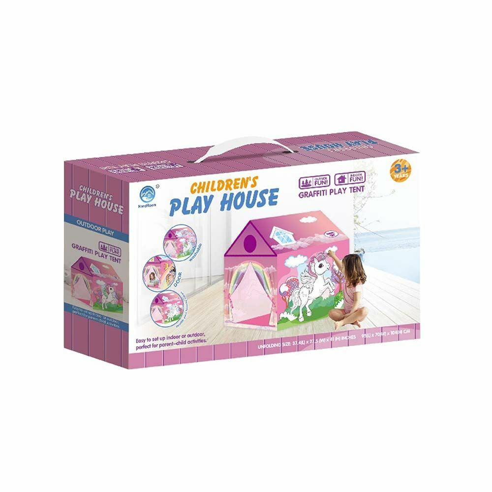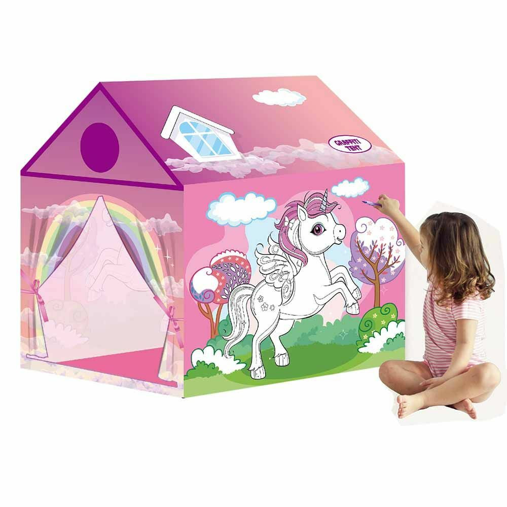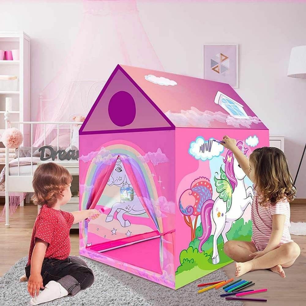 Kiszínezhető játék sátor a gyermekek legnagyobb örömére! Beltéri vagy fedett helyen történő játékra vagy akár alvásra is. Anyagának köszönhetően a játék sátor mintája kiszínezhető és lemosható, így mindig új és új ötleteket valósíthatnak meg, ami fejleszti a kreativitásukat és a kézügyességüket. Több típusának köszönhetően fiúknak és lányoknak egyaránt jó szórakozást nyújt, és játékokkal, plüssökkel kitöltve igazi kuckós élményt biztosít nekik.