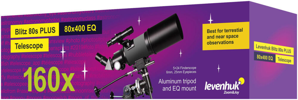 A Levenhuk Blitz 80s PLUS teleszkóp egy rövid fókuszú és széles látómezejű akromatikus refraktor, amely nagy felbontásban jeleníti meg a képeket. A teleszkóp a magas rekesznyílásnak köszönhetően alkalmas asztrofotózáshoz. Megfigyelheti a világűrt és a világos mélyég-objektumokat is, igaz, az utóbbiakat nem részletgazdagon.