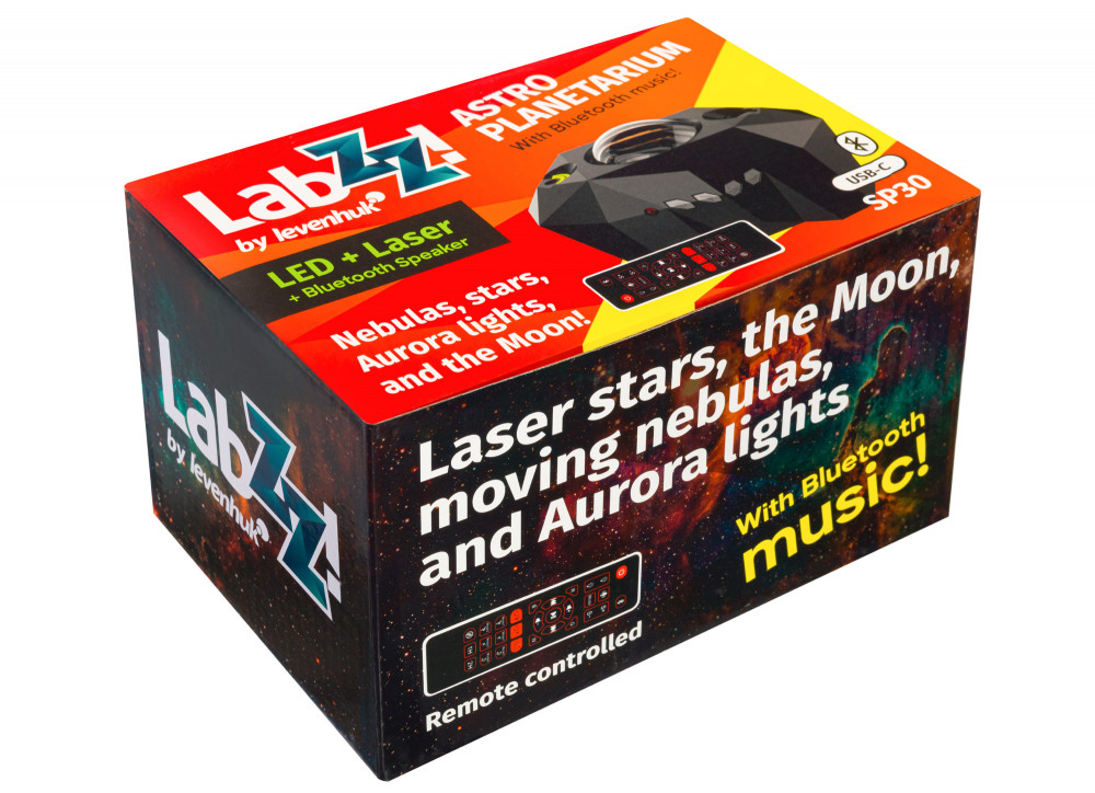 Fekete színű, stílusos és többfunkciós Levenhuk LabZZ SP30 csillagplanetárium távirányítóval. Teljes pompájában mutatja a csillagokat, a Holdat és az északi fényt – közvetlenül szobája mennyezetén vagy falán. A készülék ezenkívül tudja, hogyan kell okostelefonjáról zenét bekapcsolni, támogatja a hangvezérlést, így akár okos hangszórót is helyettesíthet. A csillagplanetárium szemet gyönyörködtető moduláris kialakítása lenyűgözi az innovatív technológiák minden otthoni rajongóját. Fekete színben készült, a sci-fi filmek futurisztikus apró eszközeire hasonlít, és tökéletesen illeszkedni fog a high-tech stílusú belső terekbe.
