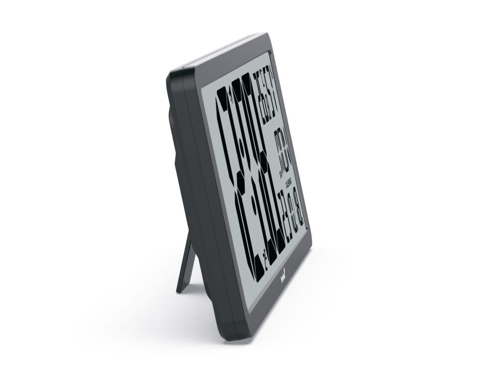 A modell másik előnye az óra nagy számjegyei, amelyek szinte a teljes kijelzőt elfoglalják. A méretüknek köszönhetően még messziről is jól leolvashatók. A további adatok kisebb betűvel jelennek meg. A kijelző nagy kontrasztjának köszönhetően nem gond leolvasni az adatokat. Megjeleníti a hőmérsékleti és páratartalmi értékeket, a hét napját és a dátumot. Ezenfelül még két ikon jelenhet meg a kijelzőn: az ébresztőóráé és a szundi funkcióé. A vezérlőgombok a jobb oldali panelen helyezkednek el, könnyen hozzáférhetők, még csak oda sem kell nézni.