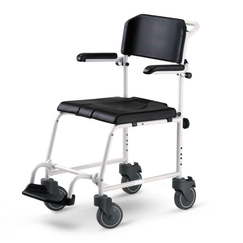 Olyan fürdetésre alkalmas kerekesszék, mely nagyfokú mobilitást nyújt Önnek és lehetővé teszi a könnyebb tisztálkodást. Kombinált tusoló és WC-s kerekesszék. Beépített vödör tartóval, felhajtható karfával és lábtámasszal. A váz karc- és ütésálló műanyag bevonatú alumínium. A csavarok, kötőelemek anyaga rozsdamentes acél. Párnázott üléssel, felhajtható párnázott kartámasszal, és lábtámasszal, tartósínnel az opcionális vödör számára az ülés alatt. Anatómiailag formázott ülés (intim részen kivágással) és háttámla.