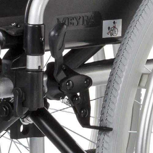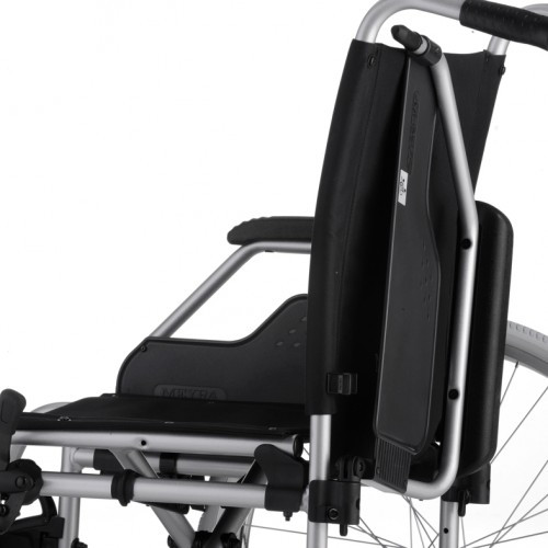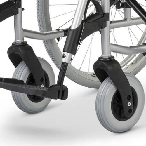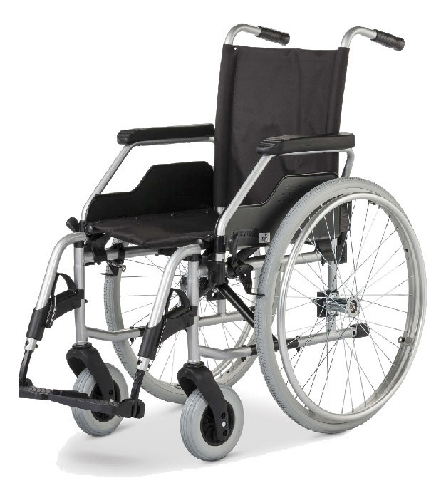 Sztenderd kivitelű, nagy terhelhetőségű, acélvázas kerekesszék. A kartámasza csapott kivitelű, mely asztal mellett is használható, valamint az Ön kényelme érdekében magasságban állíthatóak. A kerekesszékbe való beülést és kiszállást segítendő a kartámaszok fel- és hátrahajthatók, kivehetők, valamint ruhavédő lemezzel vannak ellátva.Nagyon jó gördülési tulajdonsággal bíró kerekesszék, melynek ideális súlypont elhelyezése lehetővé teszi a járdaszegélyekre történő könnyű feljutást (ezért elsősorban dinamikus, megfelelő egyensúlyérzékű embereknek javasoljuk). Ezüst színű porlakkozott kivitelben készül fekete gyöngyvászon háttámla és üléshuzattal. A kerekesszék sokrétű beállítási lehetőségei garantálják, az Ön igényeinek legjobb kielégítését. A vádli tartó tépőzáras heveder megakadályozza a lábak hátracsúszását a talptámaszról. A heveder hossza a tépőzárak oldása után a kívánt hosszra beállíthatóak.
