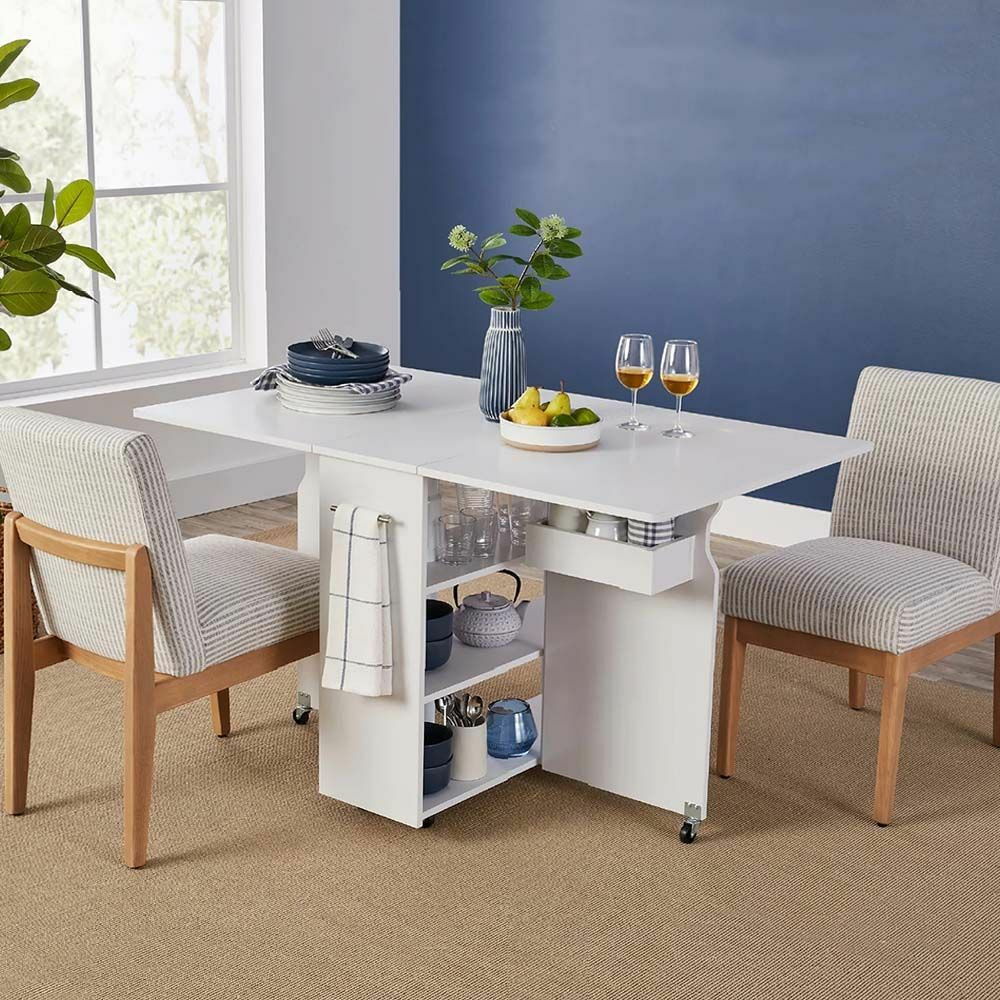 Az összecsukható gurulós asztal, kinyitható asztallapjával a legkisebb lakásokba is praktikus és esztétikus megoldást jelent.