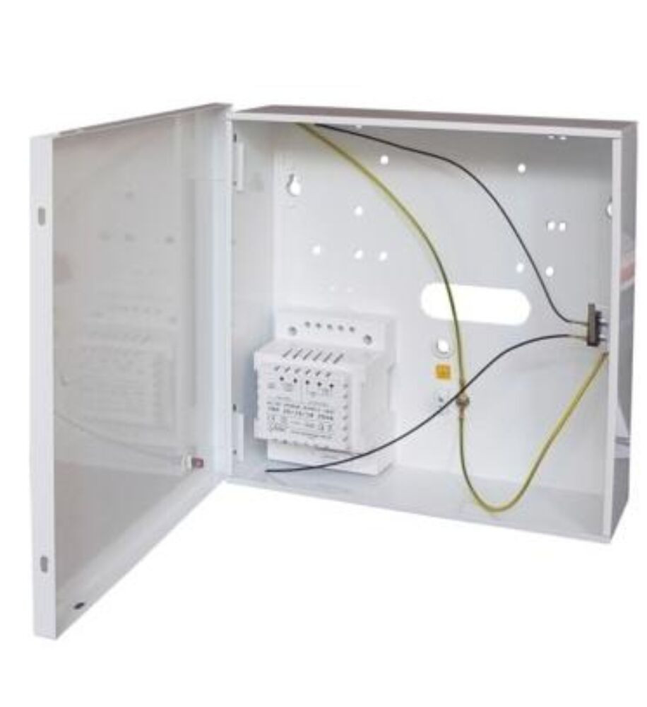 Univerzális, fém riasztódoboz riasztó központokhoz, tápegységgel, fehér, 250x250x80 mm.