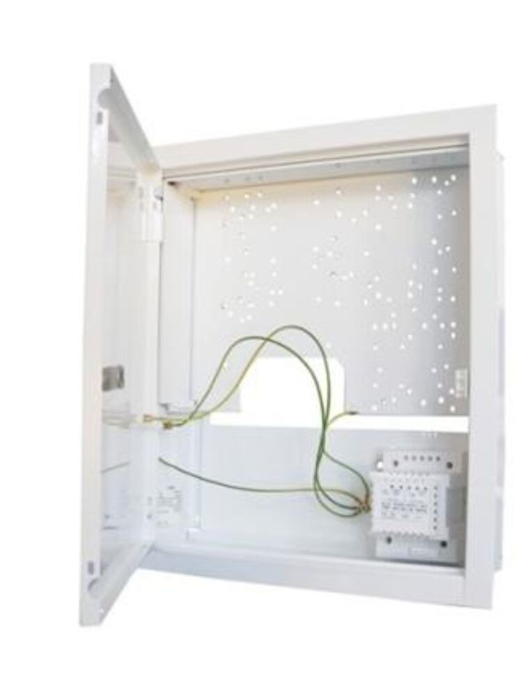 Süllyesztett fém doboz riasztóközpontokhoz, 16-18VAC, szabotázsvédett, zár, 300x300x105 mm.