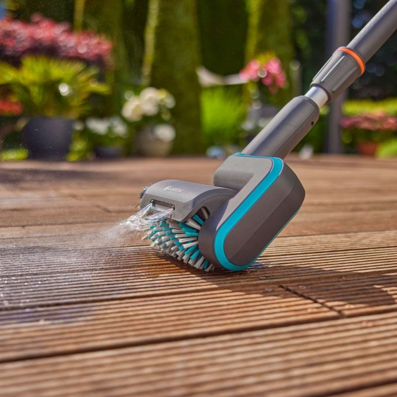 A Gardena a kültéri tisztítószerek piacán széles és strukturált termékválasztékot kínál, amely 360 fokos szolgáltatást nyújt! A Gardena AquaBrush Universal 04/18V P4A 14842-20 akkumulátoros multifunkciós tisztító az egyik legátfogóbb és legsokoldalúbb termék, amely az ablakok, pergolák, kényes felületek, valamint a kültéri sétányok, utak, medenceszélek és lépcsők tisztítására irányul. 2 darabból áll, amelyek különböző kültéri tisztítási igényeket elégítenek ki a viszonylag nagy felületeken lerakódott szennyeződések vízsugárral történő eltávolításával: Aquabrush Patio 03/18V P4A Universal hengerkefe, padlóhoz és a puha tárcsás kefe ablakokhoz és kényes felületekhez. Biztosítja a teljes felület egyenletes, sérülésmentes tisztítását; a puha tárcsás kefe kiválóan alkalmas ablakok, pergolák és függőleges felületek tisztítására. A kialakítás könnyű és jól kiegyensúlyozott, a teleszkópos nyél 1330 és 1364 mm közötti tartományban mozog , így a legjobb pozícióban dolgozhat fáradtság nélkül és anélkül, hogy meglehetősen kihívást jelentő magasságokat érne el. A víztömlővel való rögzítés egyszerű és gyors , a nyél alatti pozíció soha nem zavarja a munkát; a hengerkefét körülvevő nehéz műanyag borítás megakadályozza és megvédi a kezelőt a fröccsenéstől. Az elülső fogantyú lehetővé teszi a kefe működtetését használat közben , míg a funkcióvezérlők a fő fogantyún találhatók; a vezérlőszelep biztosítja a vízfogyasztás folyamatos szabályozását a szennyeződésre való hatás igényének megfelelően.