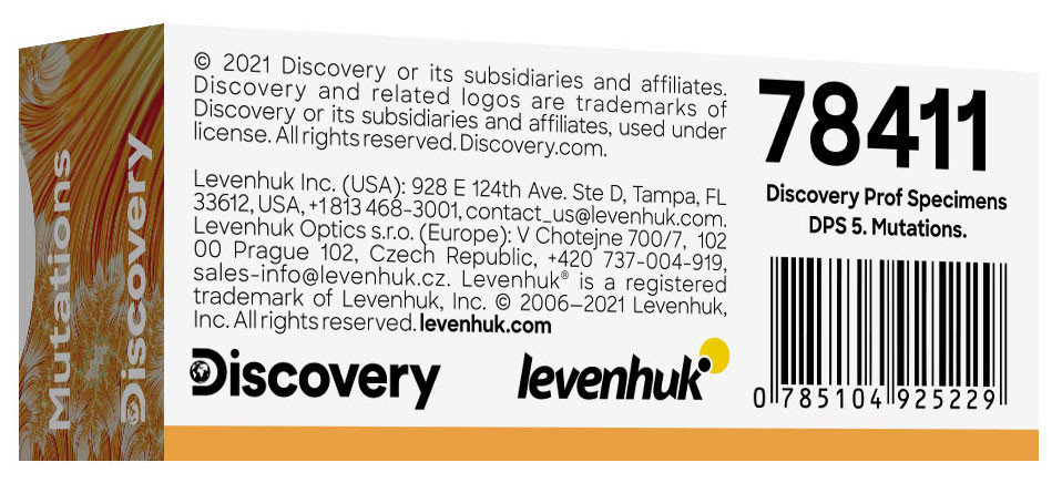 A Levenhuk Discovery Prof DPS 5 mikropreparátum mintakészlet. A „Mutációk” átlátszó mintákat tartalmazó, öt darab tárgylemezből álló sorozat, amelyet mikroszkóppal elvégezhető, fejlett kutatásokhoz állítottunk össze. Többek között állati és növényi szövetminták tartoznak ide, bemutatva az élőlények örökletes felépítésében bizonyos külső tényezők hatására bekövetkező változásokat is. A tárgylemezek kompatibilisek bármilyen márkájú, áteső fénnyel működő mikroszkóppal. Önnek mindössze annyit kell tennie, hogy az előkészített tárgylemezeket a mikroszkóp tárgyasztalára helyezi és a berendezést alsó megvilágításra kapcsolja át.