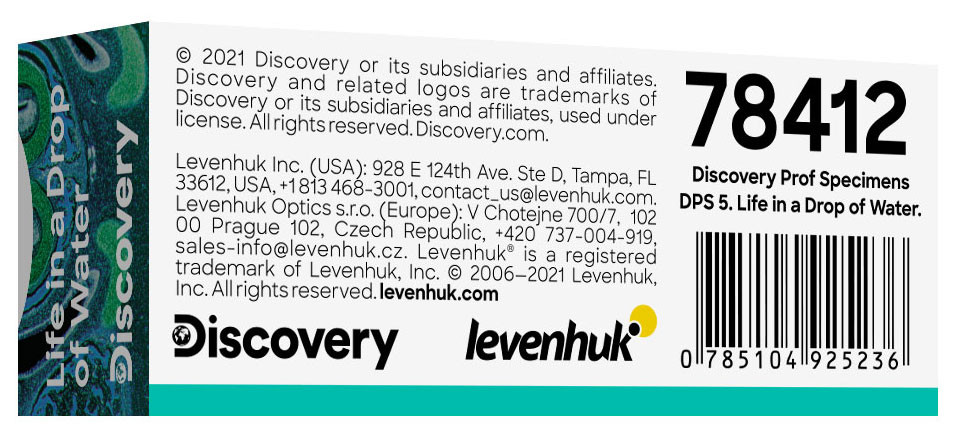 A Levenhuk Discovery Prof DPS 5 mikropreparátum mintakészlet. Az „Élet egy csepp vízben” készlethez öt darab, professzionális minősítésű tárgylemez tartozik, amelyek az édesvízi élővilág alábbi biológiai fajait tartalmazza: baktérium, protozoon (ejtsd: [protozún]), ízeltlábúak és plankton.