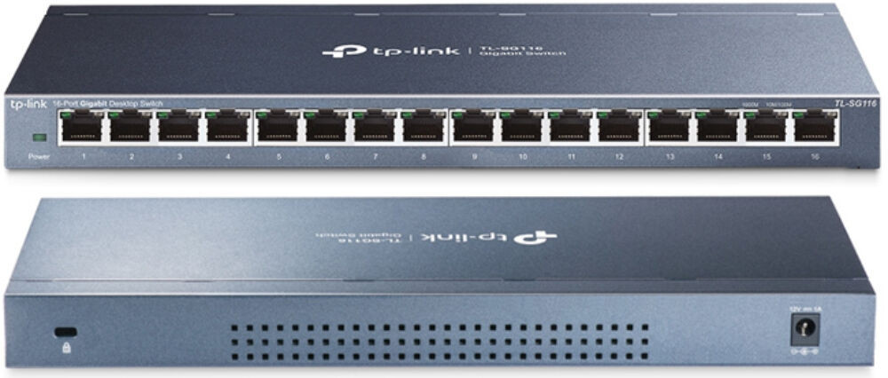 Hálózati kapcsoló, asztali/fali, gigabit, 16 db 10/100/1000Mbps port, fém borítás, 12VDC.
