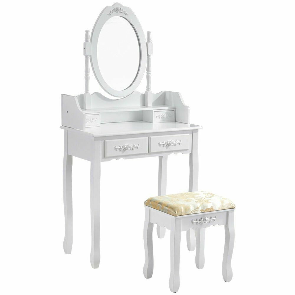 Fából készült, tükrös fésülködő asztal és szék hálószobába, öltözőbe, gardrób szobába. Elegáns fehér színe és kialakítása miatt igazi dísze lesz a lakásnak. 2 db kisebb és 2 db nagyobb fiókkal rendelkezik, melyekbe kényelmesen pakolhatod bele ékszereidet, sminkjeidet, egyéb kiegészítőidet.