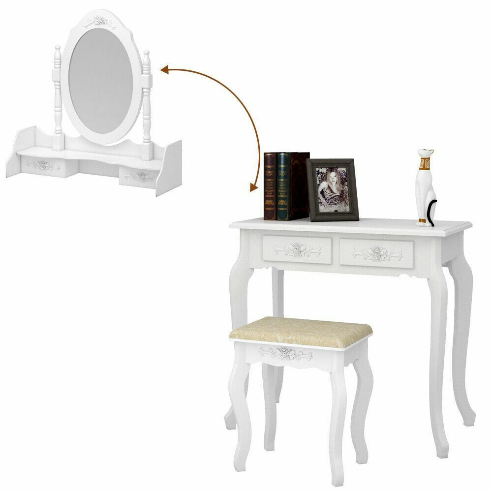 Felső tükrös, polcos része levehető, így akár íróasztalként is funkcionálhat. Domború díszítései klasszikus megjelenést kölcsönöznek az asztalnak és a széknek. A szék felső, párnázott része dekoratív kárpittal van ellátva, ezáltal még különlegesebb.